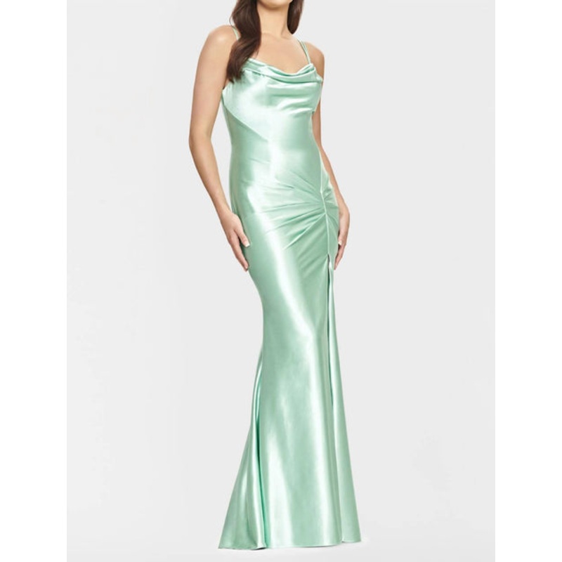 Say ‘I do’ in style and let your personality shine through in this elegant and timeless dress. With its classic silhouette, this is the perfect wedding dress for the stylish bride to be.Faviana Style S10807 Long Stretch Satin Cowl Neck Dress Featuring Front Pleats, Double Straps With Lace-Up Back Along With A Ruched Butt And An Invisible Zipper And Hook & Eye Closure.