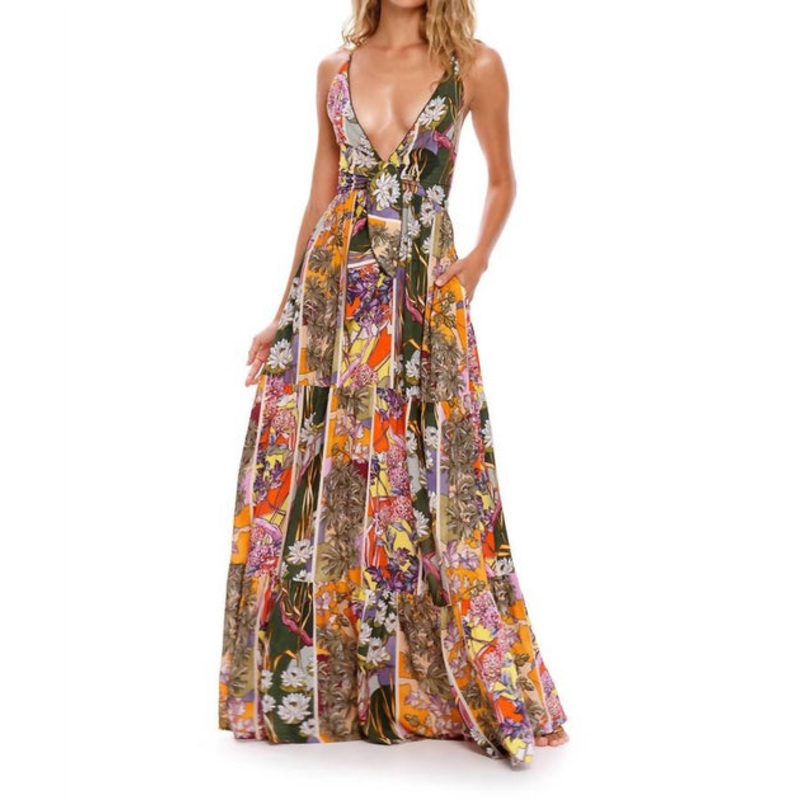 Style this maxi with your favorite statement necklace and sandals for the perfect look.Plunging cutout at front with crisscross halter straps. Lace-up back with tassel ties. Partial elastic waistband with tie accent at front. Floral print and picot trim. Tiered skirt with ruffle hem. On-seam hip pockets. Unlined. Dry clean.
